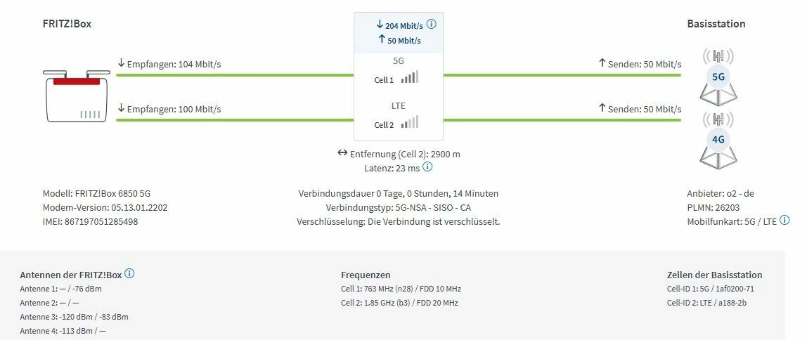 Die Fritzbox 6850 5G, unterstützt (anders als der o2 Homespot 5G) leider kein Lowband ENDC.