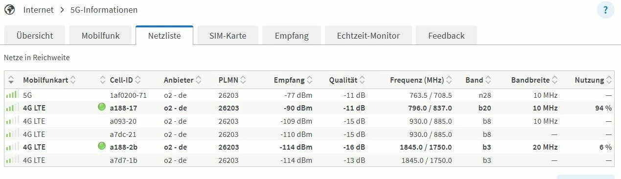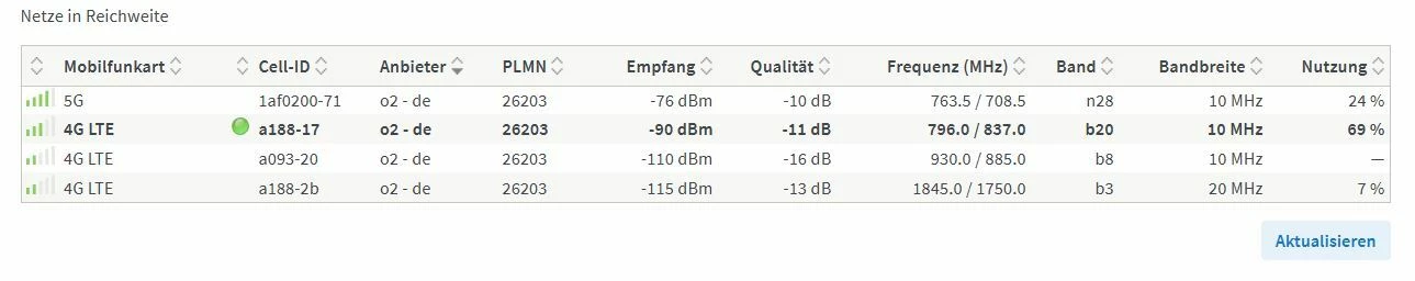 PS. Seltsam ist auch, dass die Box sich nur mit 4G verbindet, obwohl es so aussieht, als wär die 5G Zelle grad das beste Signal.