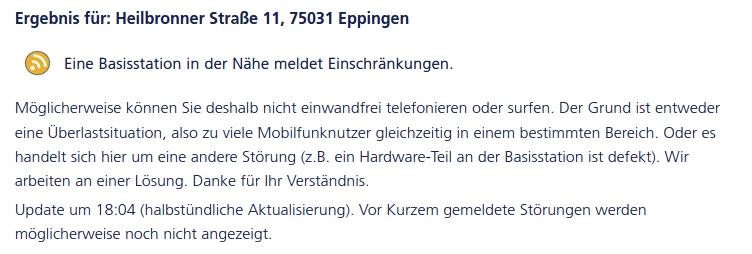 Der Livecheck meldet hier (vermutlich) eine Überlastung einer Basisstation: