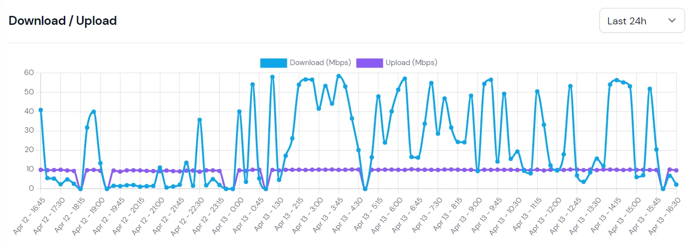 Warum die Leistung an dem einen oder einem anderen Tag vorhanden gewesen ist, kann ich im Detail nicht nachvollziehen. Wie sehen hier lediglich Durchschnittswerte. Diese zeigen weiterhin eine erhöhte Auslastung, was ich ja vor einigen Tagen schon beschrieben hatte und was von deinen Speedtests weitestgehend auch unterstrichen wird. Leider ist es in solchen Situationen nicht unüblich, dass die Geschwindigkeiten je nach Uhrzeit variieren und zum Beispiel in der Nacht scheinbar keine Einschränkungen vorhanden sind.