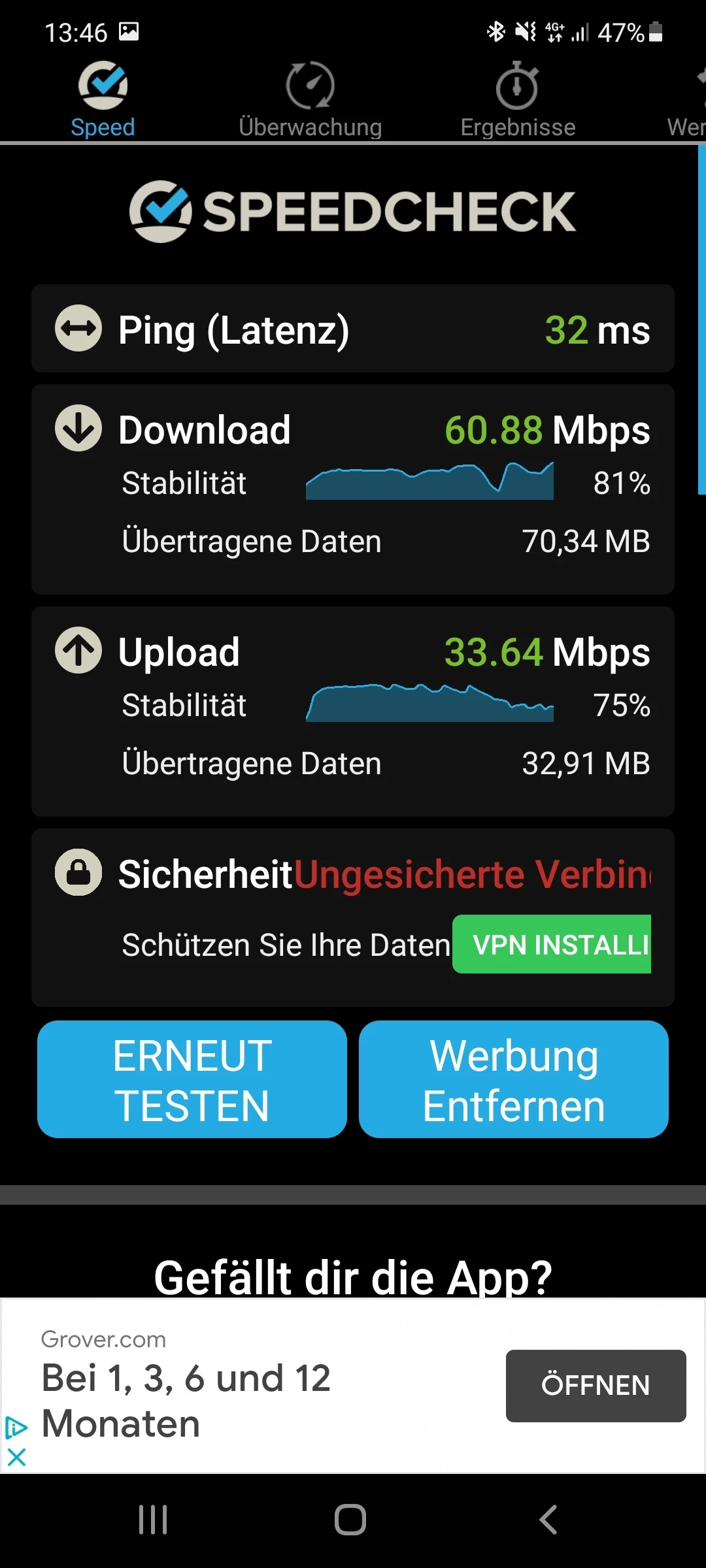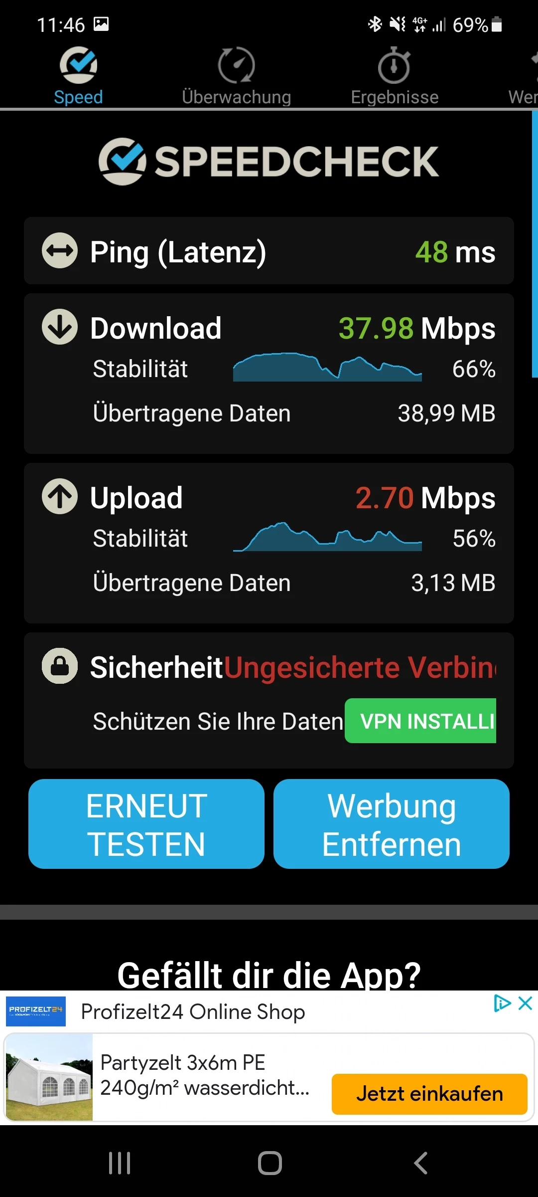 Und solche Werte erwarte ich nichtmal mit dem Router. Aber stabil so um die 30Mbit wären schon schön 😅
