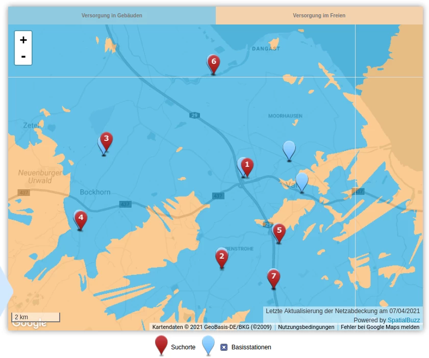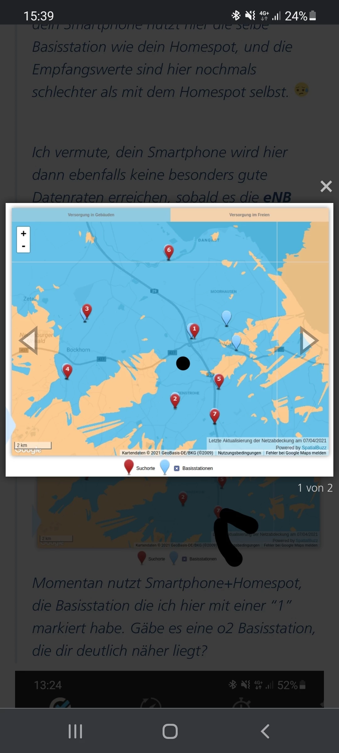 Momentan nutzt Smartphone+Homespot, die Basisstation die ich hier mit einer “1” markiert habe. Gäbe es eine o2 Basisstation, die dir deutlich näher liegt?