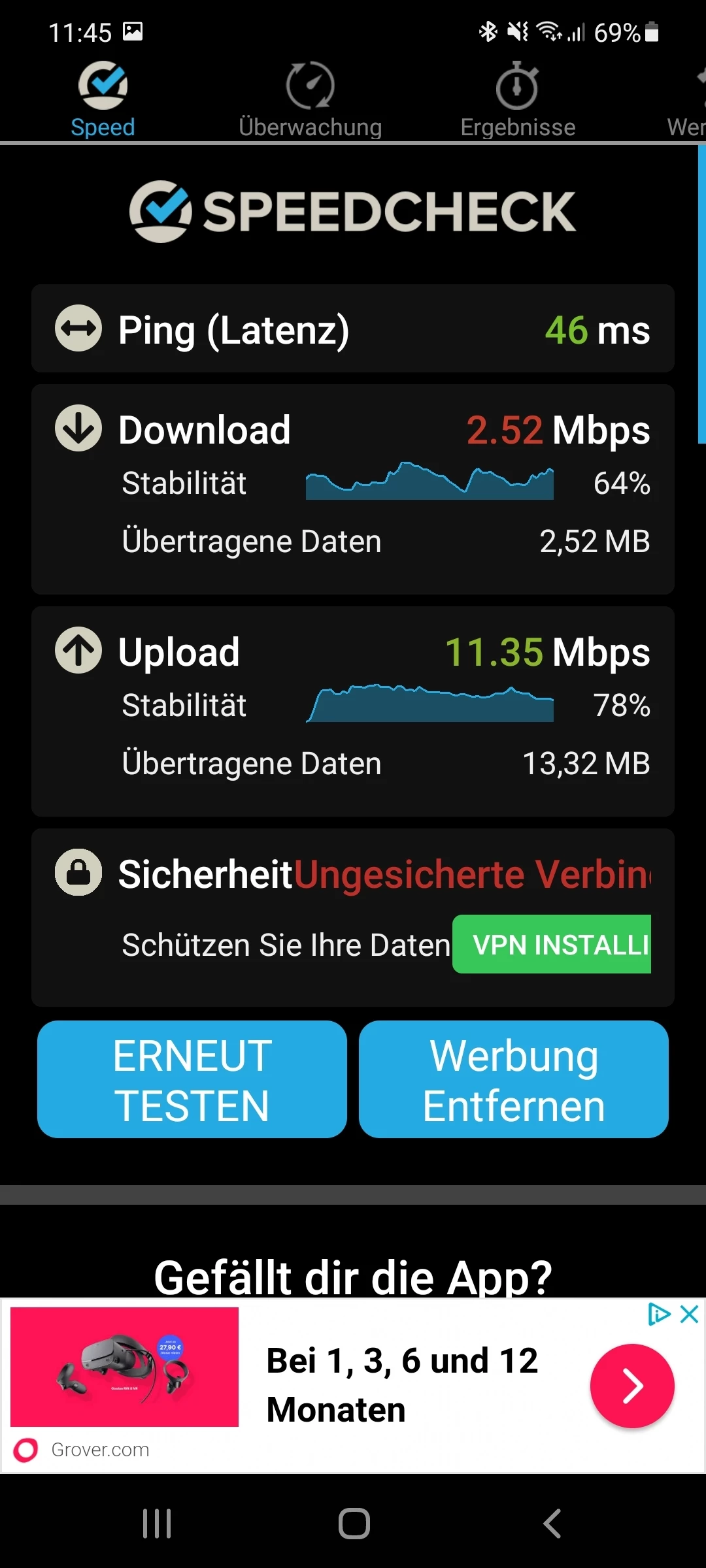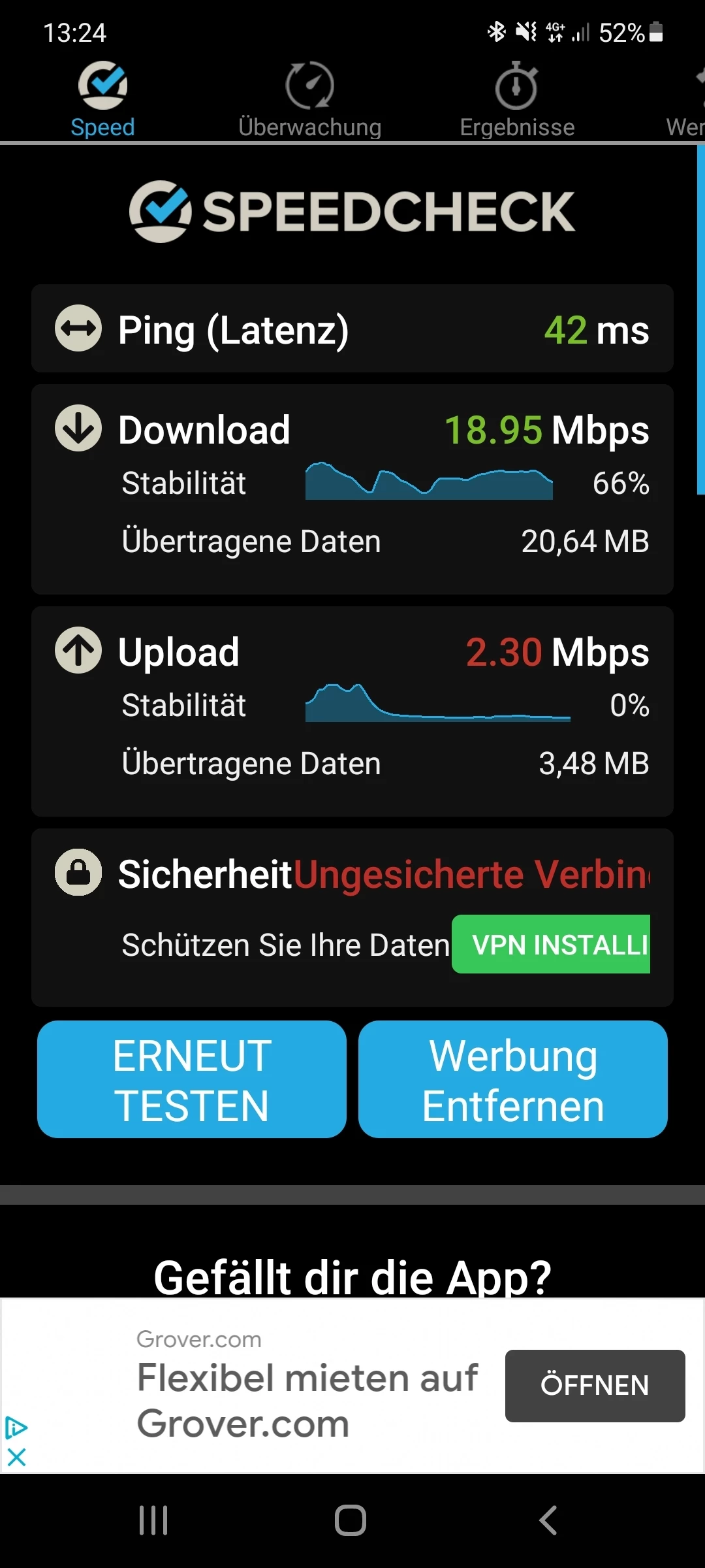 Ich habe die App eben hinter dem Haus verwendet am denkbar ungünstigsten Platz zum Sendemast. Daher sind die Werte auch so schlecht. Die Messung ist ebenfalls nicht an einem perfekten Platz, ebenfalls im hinteren Teil des Hauses. Aber im Eingangspost habe ich schon 2 Tests angehängt an besseren Standorten und da sind die Geschwindigkeitsunterschiede eklatant.