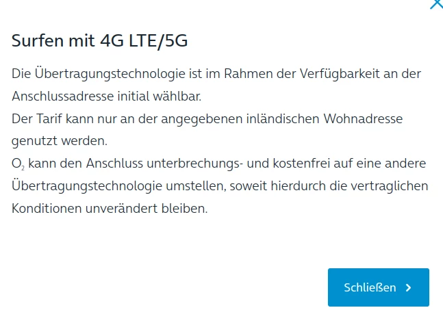 Nach längerer Recherche entschieden wir uns für den o2-Homespot mit 50 mbit/s. Nach einem sehr ausführlichen Telefonat mit dem Kundenservice wurde mir dort versichert, dass an man an unserer Wohnanschrift nahezu die komplette Geschwindigkeit abrufen könne.