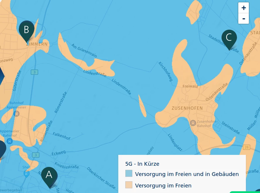 Hallo ​@Tom_ . Vielen Dank für die Hilfe. Der HomeSpot - scheint das verlinkte Modell zu sein, wir haben ihn auch erst vor ein paar Monaten bekommen - steht zwischen Falkenhof und Eckweg auf der Karte, also deutlich am nächsten an Station A. Bis Station C sind es knapp 3 km. So wie ich es sehen kann, scheint die gute 24031283 auf Band 28, die Station B auf B 20 zu sein, so interpretier ich das zumindest,