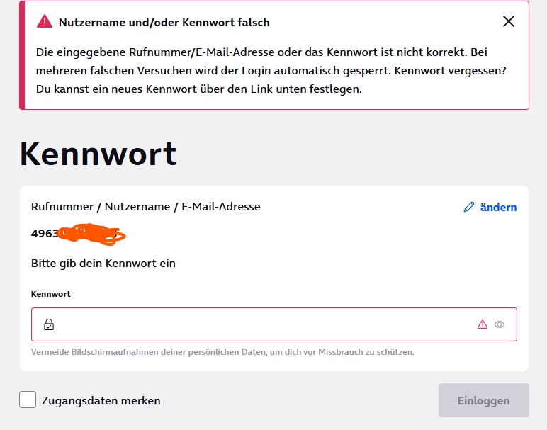 Wenn ich ein falsches Passwort eingebe, erscheint im Feld „Rufnummer / Nutzername / E-Mail-Adresse“ plötzlich eine Zahlenfolge, die ich überhaupt nicht kenne – und nicht die Festnetznummer, die ich zuvor eingegeben habe.