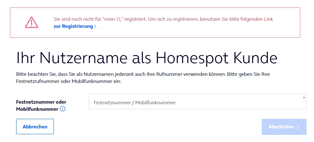 • Anschließend bekam ich die Meldung: „Sie sind noch nicht für 'Mein O2' registriert. Um sich zu registrieren, benutzen Sie bitte folgenden Link zur Registrierung.“