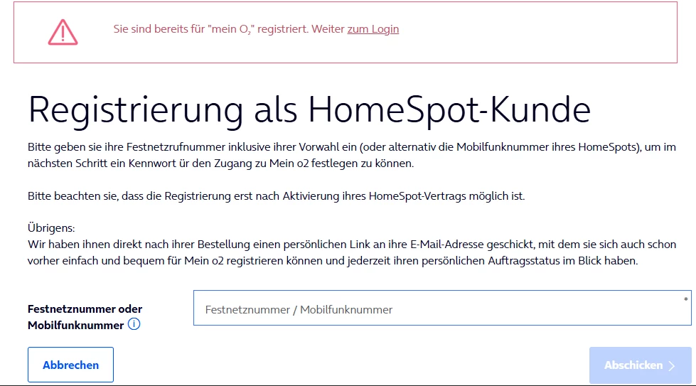 Daraufhin habe ich den Registrierungsprozess gestartet, als Homespot-Kunde die Festnetznummer eingegeben – und diesmal kam die Meldung: „Sie sind bereits für 'Mein O2' registriert. Weiter zum Login“.