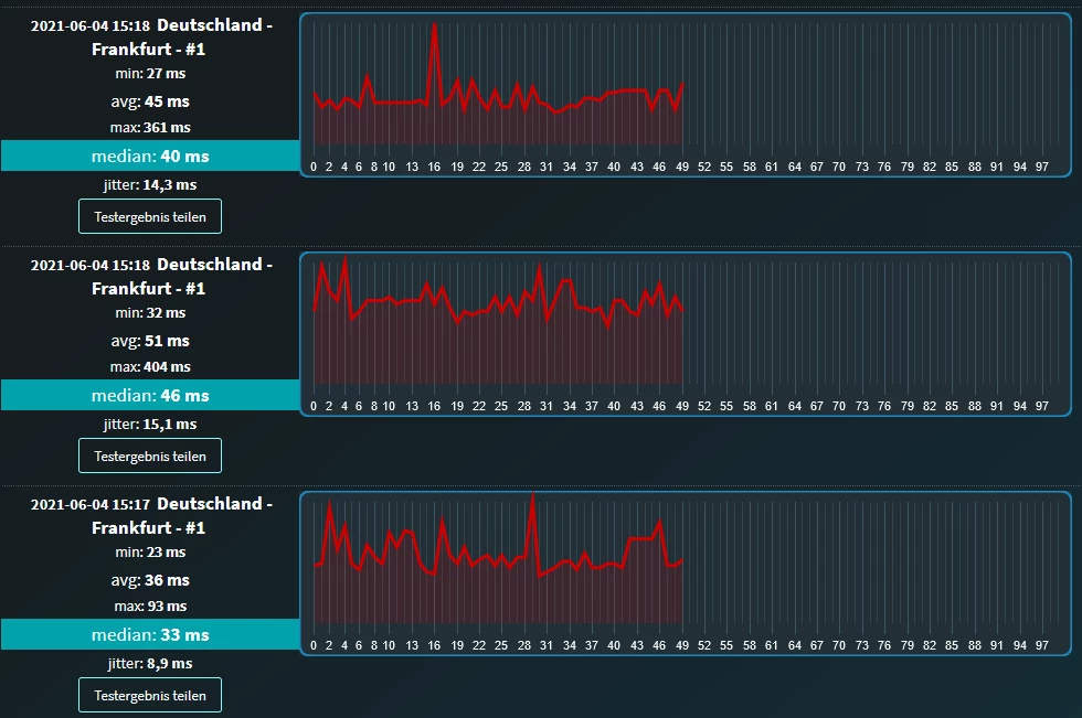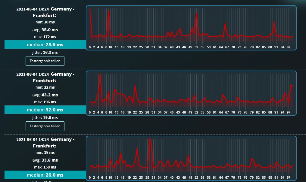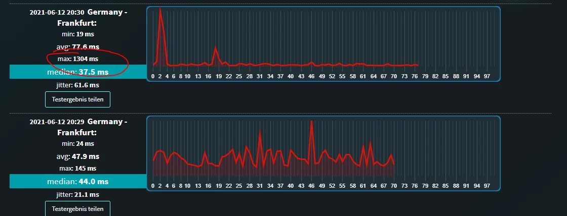 Wie ich auf DNS-Probleme komme? Das war und wäre weiterhin meine letzte Idee. Wo wohnst Du denn? (Bitte nur eine PLZ ohne genauen Adressangaben!) Ich z.B. wohne in Düsseldorf und wenn selbst ich solche Ausschläge habe, dann heisst das schon was. Hatte ich vorher nie.