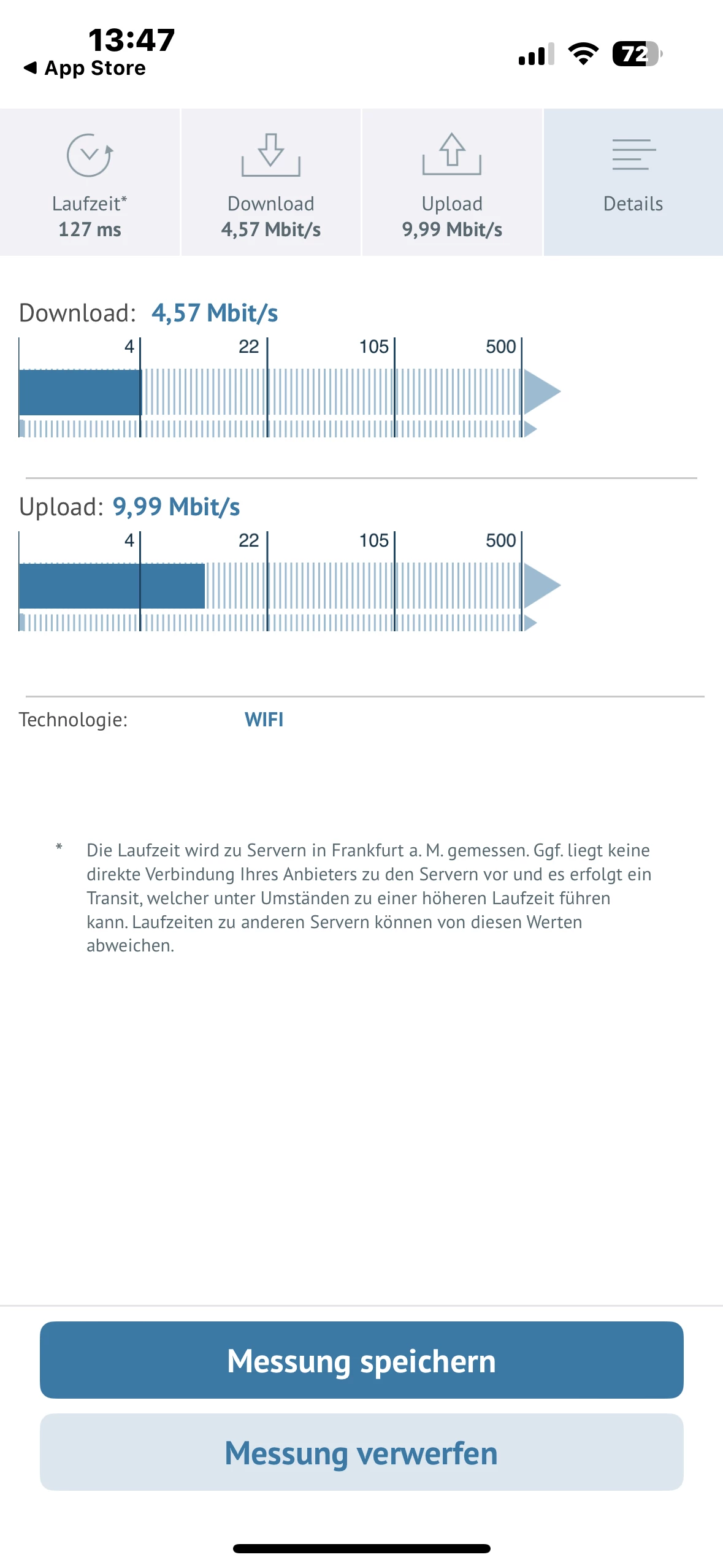 Dummerweise ist das der amtliche Test, mit nur dem Du Ansprüche wegen Minderleistung durchsetzen könntest. Und es sieht nach Handy mit WLAN aus = irrelevant.  Ist nun mal leider so. Ich traue nur Tests mit LAN-Kabel und ohne zusätzlichen Geräten am Router!