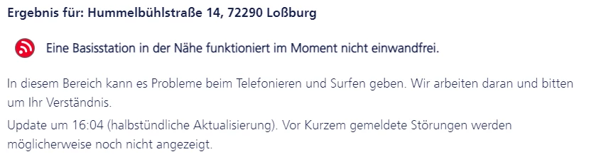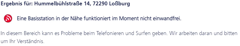 hier in der nähe der Station Hummelbühlstraße, 72290 Loßburg gibts für den homespot, nun schon seit zwei Wochen (letzter Freitag im August) keinen Anschluss mehr ans internet, seit zwei tagen wird im live check gezeigt das es nicht einwandfrei funktioniert, davor waren es Wartungsarbeiten.