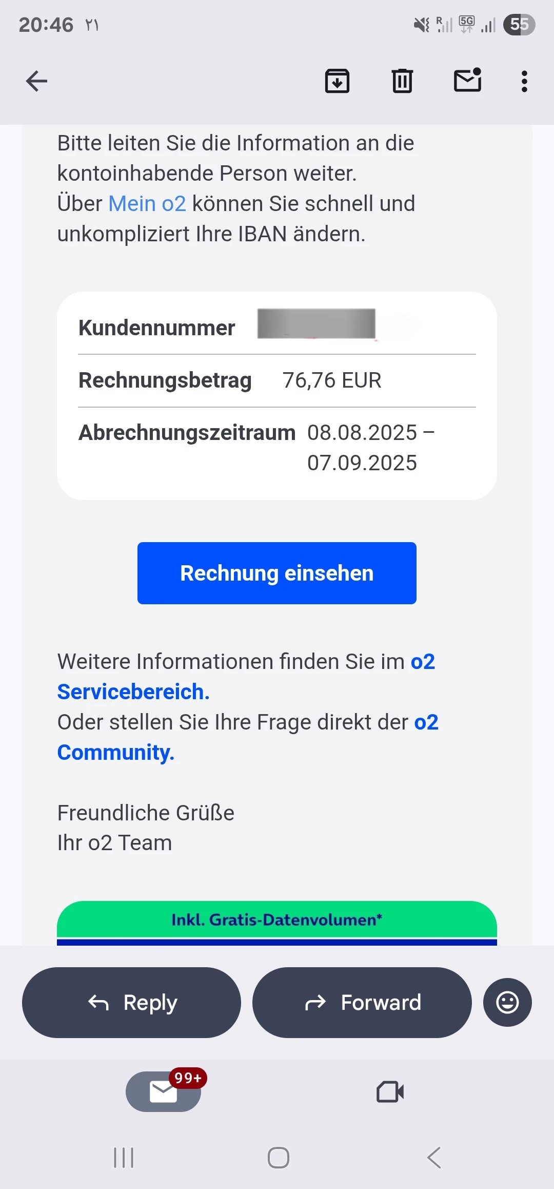 Ich mag o2 grundsätzlich sehr – auch wenn die Netzabdeckung beim Mobilfunk manchmal nicht optimal ist oder die Erreichbarkeit im Service schwach sein kann. Aber fairerweise muss ich sagen, dass die Rechnungen für die Nutzung immer pünktlich zugestellt werden.