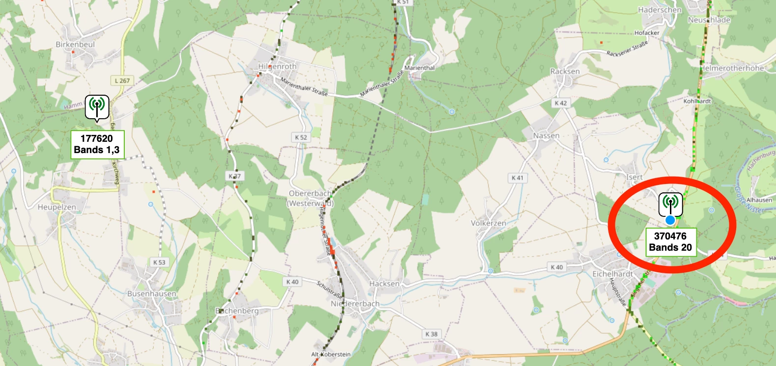 Die eingekreiste Basisstation liegt vor meiner Haustür, verbunden bin ich jedoch mit der anderen, auf dem Bild sichtbaren, Basisstation.