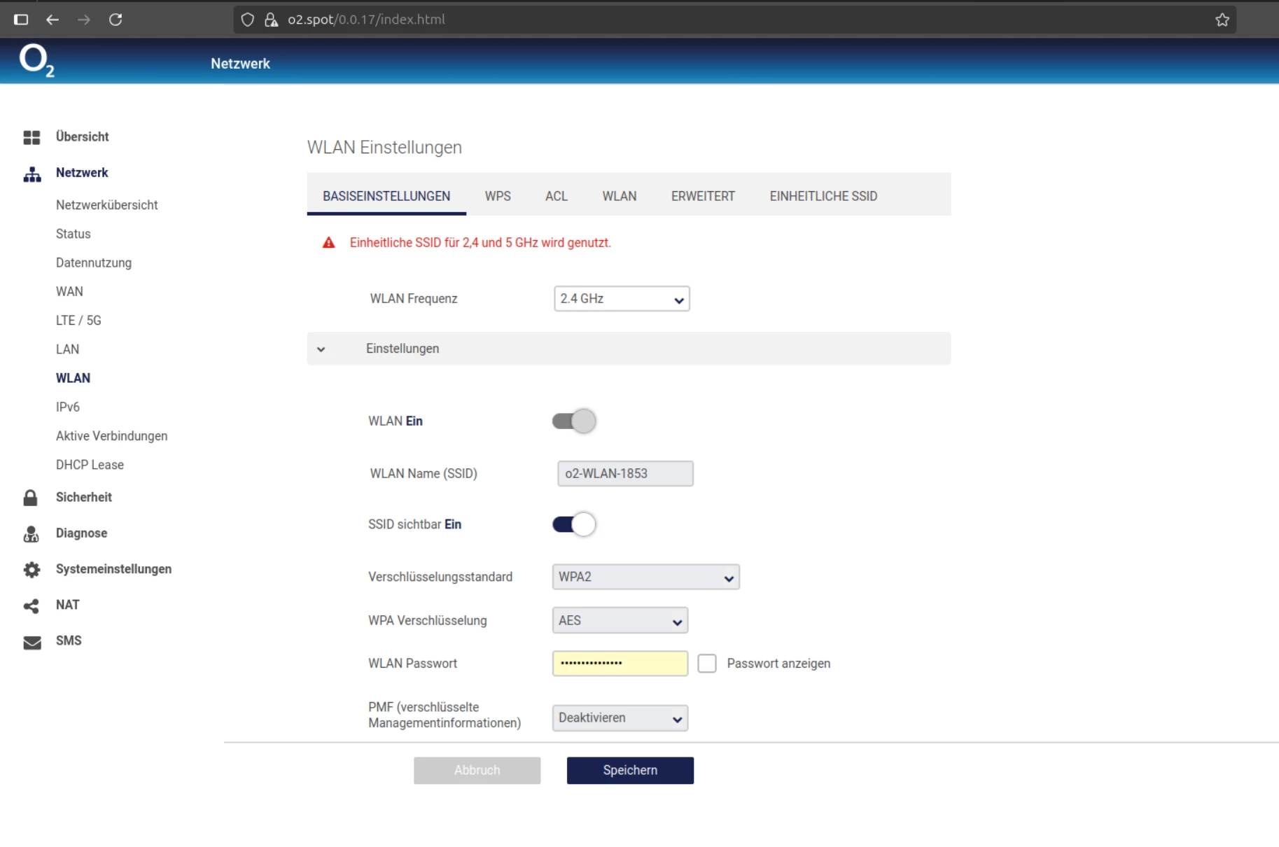 Die Warnung “Einheitliche SSID wird genutzt” soll scheinbar darauf hinweisen, dass SSID und Passwort unter “Netzwerk → WLAN → Einheitliche SSID → WLAN Einstellungen synchronisieren” geändert werden müssen. Das finde ich nicht unbedingt naheliegend aber es funktioniert.