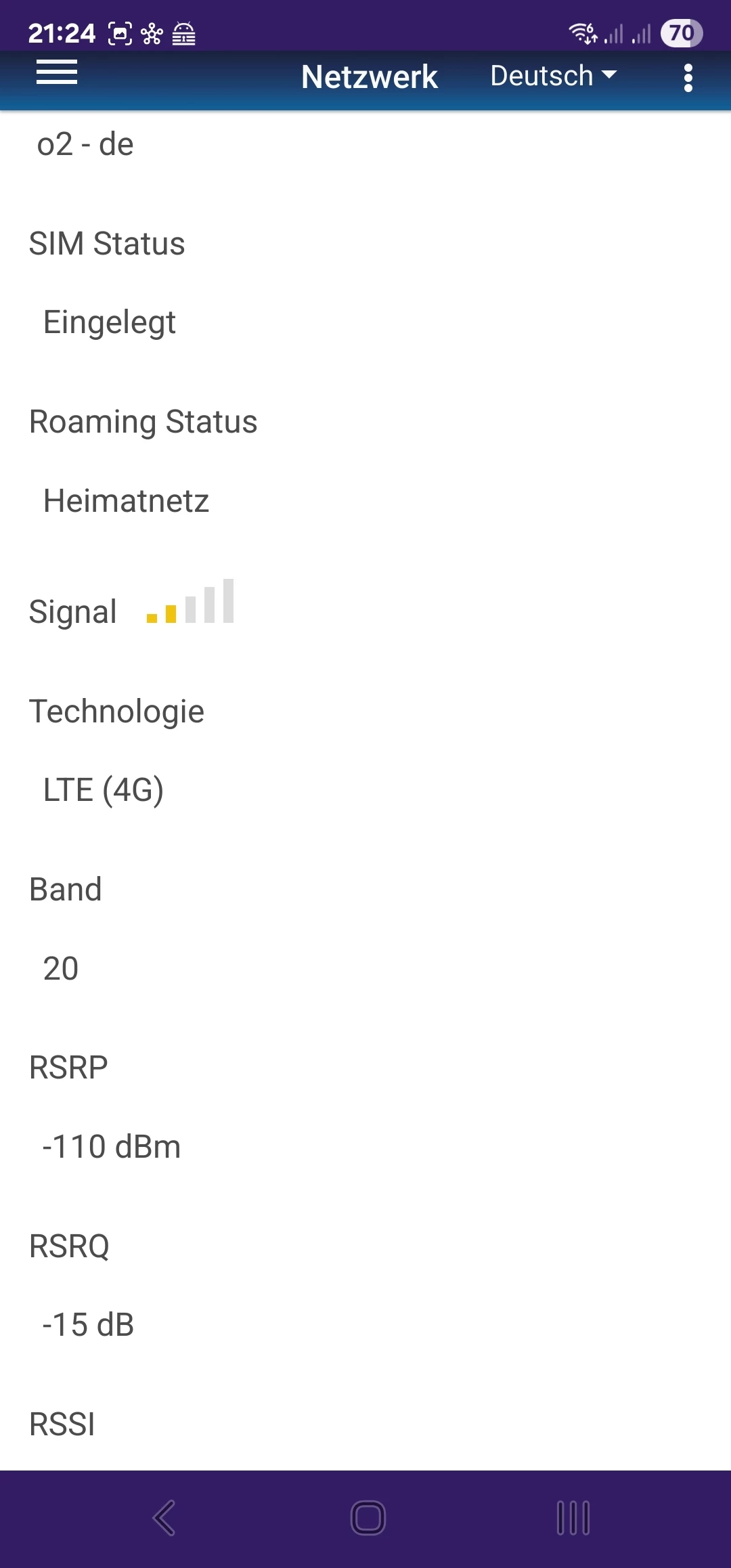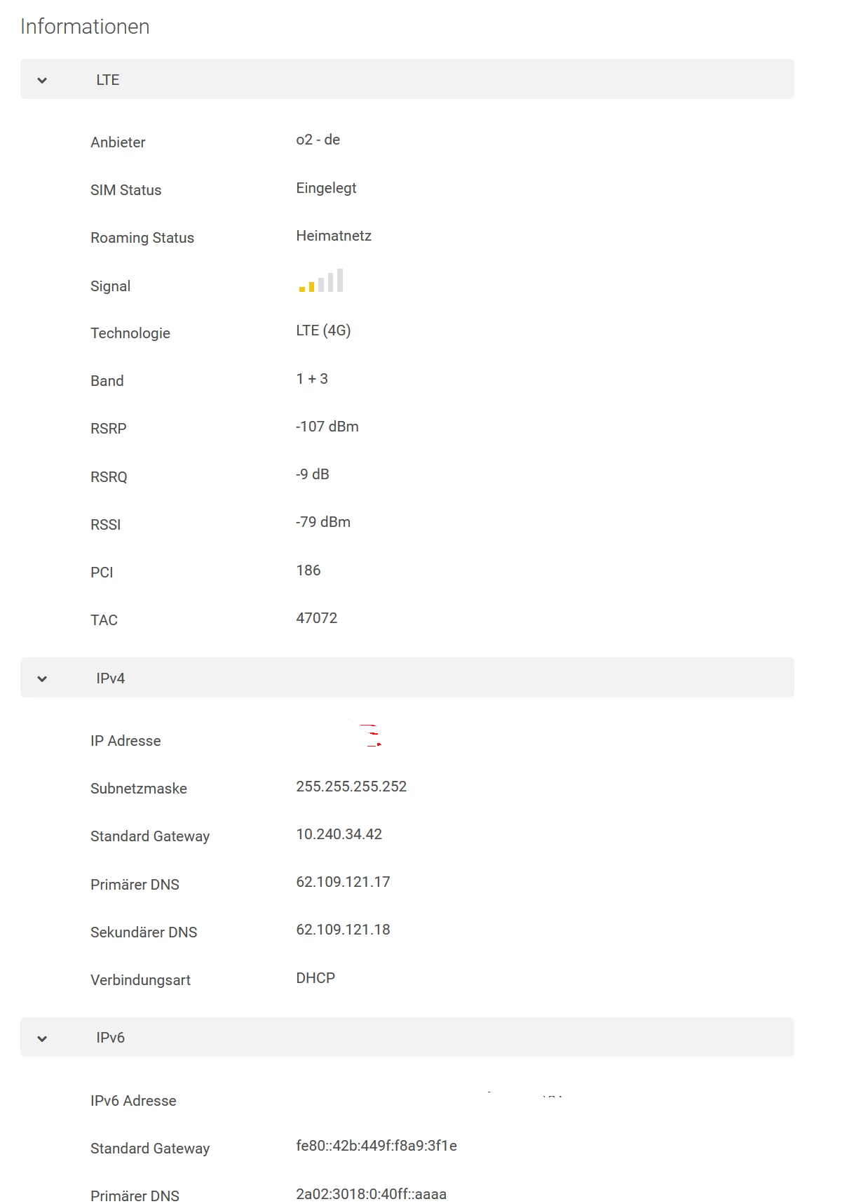 Das ist derzeit die Indoor-Empfangssituation (IP-Adresse gelöscht). Ich habe eine Antenne für außen bestellt