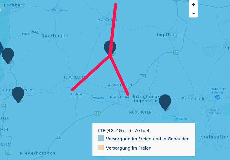 Billigheim-Ingenheim,76831, Luftline 1,5 km. Die O2-Karte mit den Senderstandorten finde ich leider nicht mehr, deshalb die Koordinaten von Google. Bei der Netzagentur hat der Mast die