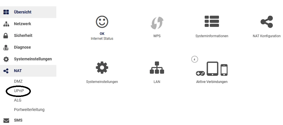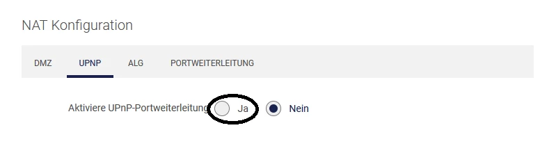 Hier klickst Du auf NAT, dann erscheint das Fenster und klickst auf UPnP: