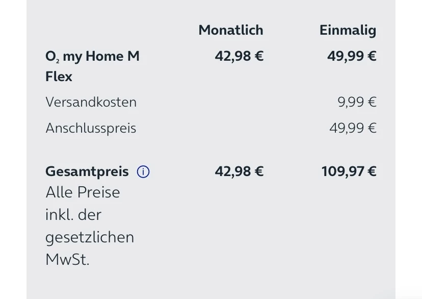 Die Frage ist: Ist die Zahlung für die Nutzung des ersten Monats des Internets in den Kosten einer einmaligen Zahlung enthalten? Oder muss ich 109,97 € + 42,98 € auf einmal bezahlen?