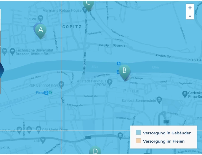 Ich denke das Problem ist hier einfach, dass es zwar viele Basisstationen in Pirna gibt, diese allerdings lediglich LTE Band 1 anbieten - was der Homespot leider nicht unterstützt. Daher wird sich dein Router die Basisstation in der Lindenstraße (ich hab diese mal mit “A” gekennzeichnet) nutzen, obwohl es Basisstationen gäbe, die etwas näher in deiner Umgebung sind..