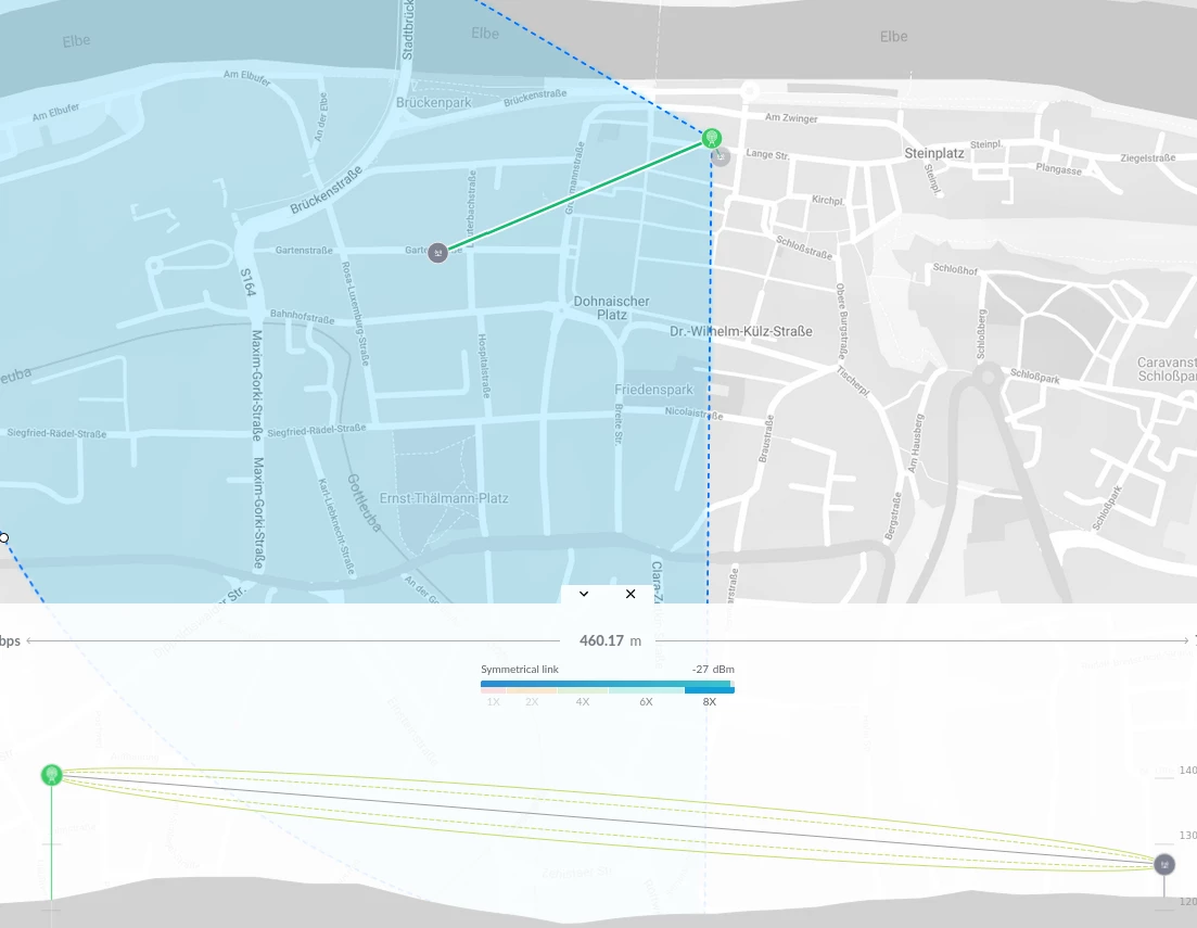 Es gäbe in der “Lange Str. 8, 01796 Pirna”eine Basistation, und diese würde LTE Band 1 anbieten, und ein Sektor zeigt auch direkt in Richtung “Gartenstraße.