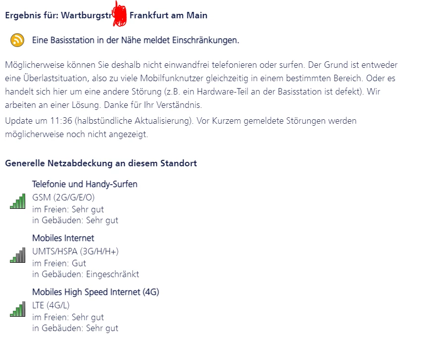 “Was in deinen Fall etwas seltsam ist, dass die Station im Cheruskerweg 48,Unterliederbach, West, Frankfurt, Hesse, 65929 aktuell gar nicht in der Netzabdeckungskarte eingezeichnet ist. :disappointed_relieved:  Das kann jetzt auf Wartungsarbeiten oder Umbauarbeiten hinweisen, aber selbst das zeigt der Livecheck nicht an.”
