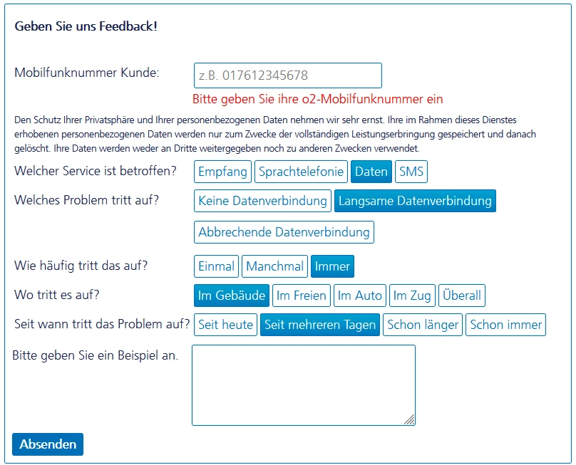 Beim Livecheck hast Du die Möglichkeit dazu. Einfach auf „Geben Sie uns Feedback“ klicken und dann möglichst genau den/die Fehler beschreiben, Beispiel: