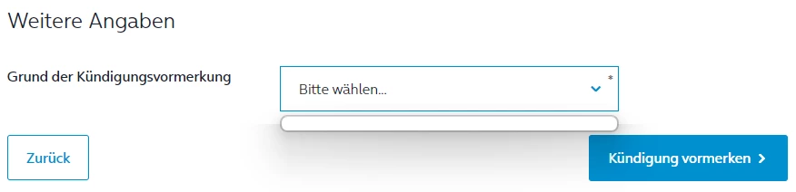 Ich wollte heute die Kündigung (fristgerecht) für meinen Vertrag vormerken. Für die Kündigung ist die Auswahl eines Grundes aus einem Dropdownmenü nötig. Wenn ich allerdings auf das Auswahlfeld klicke, ist es leer (siehe Bild).