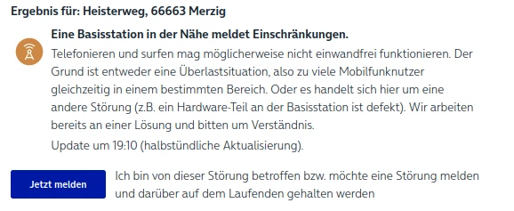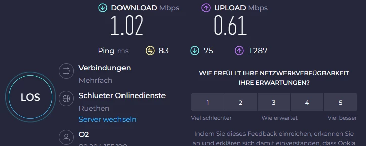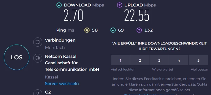 Dieser Sendemast “strahlt” jedoch nicht in unsere Richtung bzw. keine der Zellen geht laut Cellmapper über uns (Wir sind Hausnummer 85a). Wir sind immer mit der Zelle 1 Verbunden die Abends komplett zusammenbricht vermutlich wegen Überlastung. Ich habe vorhin einen Speedtest gemacht und komme auf 70 mbit Download und 20 mbit Upload. Mittlerweile sind es nur noch 10mbit und 32mbit. Abends jedoch sind es nur noch 2 mbit Download wenn es gut läuft, weniger wurde auch schon beobachtet.