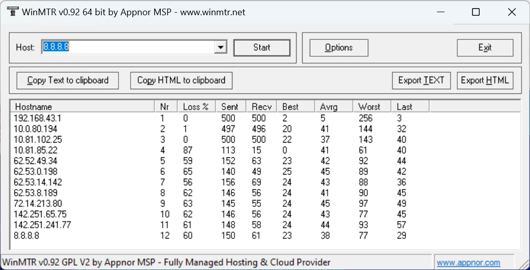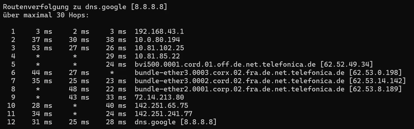 hab mir eine KI zu Hilfe genommen und 8.8.8.8 genutzt, einmal mit Tracert und einmal mit MTR.