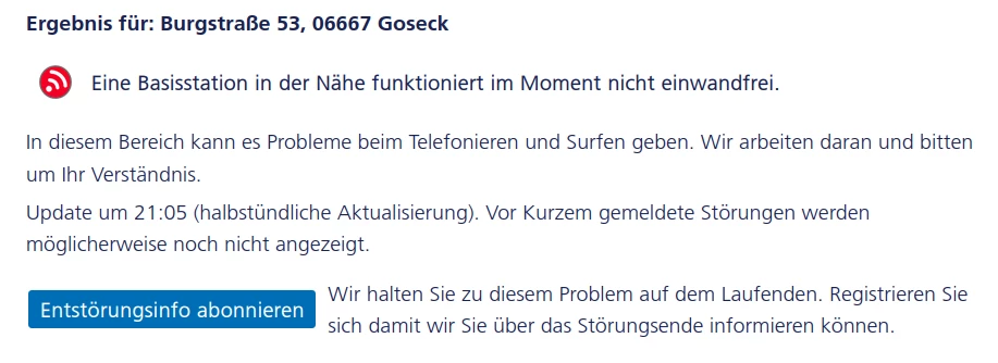 Ja, also betroffen von dieser Netzstörung scheint die Basisstation östlich der “Burgstraße 53, 06667 Goseck” sein.