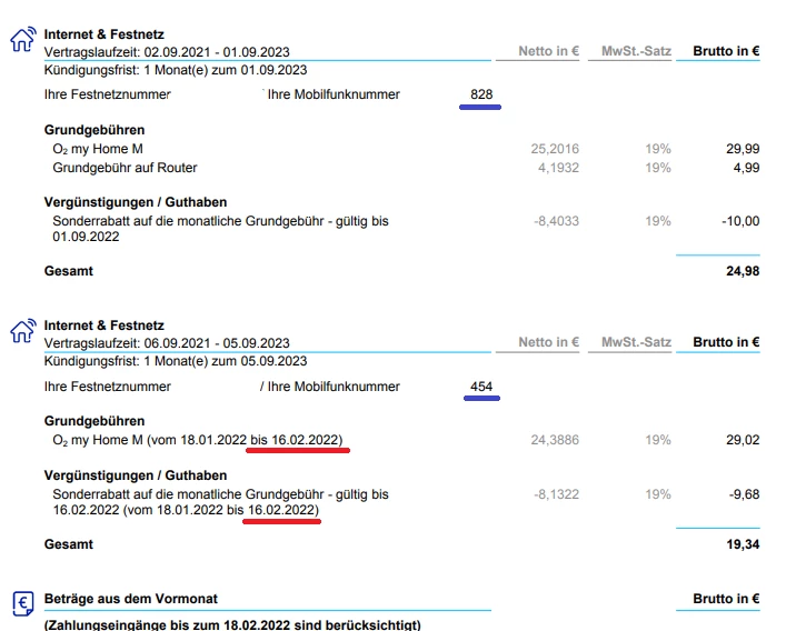 Am 16.02. hatte ich den doppelten Vertrag deaktiviert und dir auch bis zu diesem Datum alle angefallenen Gebühren gutgeschrieben. Auf der Rechnung vom 23.02. steht bei dem zweiten Vertrag ganz klar, dass diese bis zum 16.02. berechnet wurde (also nur bis zu dem Datum bis zu dem du die Gebühren gutgeschrieben bekommen hast).
