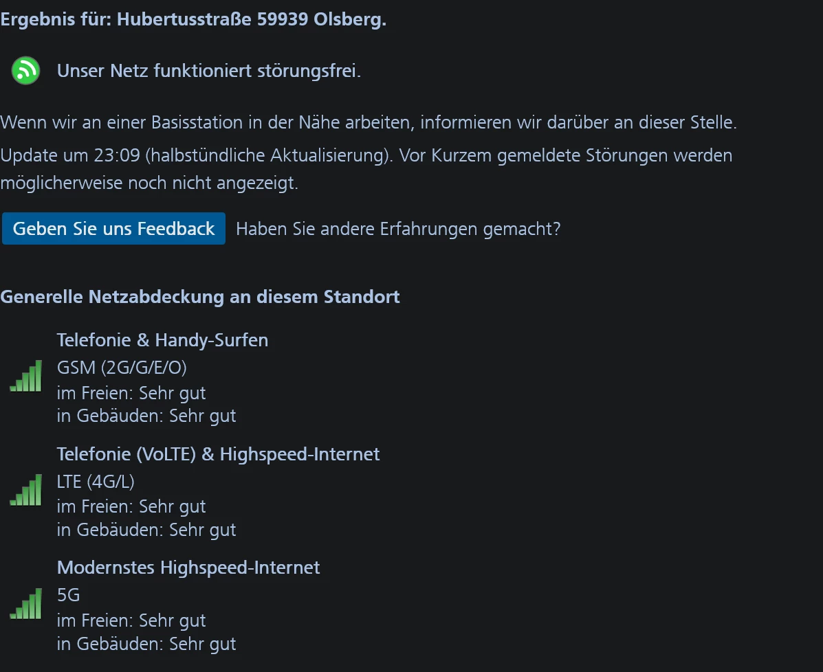 ich habe kürzlich einen Homespot Vertrag einrichten lassen und bin zwar überrascht wie gut der Ping ist jedoch ist der download katastrophal schlecht mit 13 von 100 Mbits. Ich verstehe nicht ganz warum das so ist und wie ich das verbessern kann vorallem da auf der Internetseite von o2 steht das die Verbindung gut sei, der Support sagt das auch und die LED des homespot leuchtet grün was soviel wie „Befriedigend“ heissen soll. Der nächste Mast ist 2 Straßen weiter von mir auf der Hubertusstraße 59939 Olsberg.