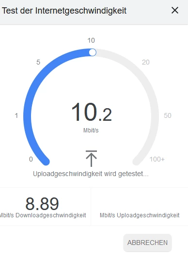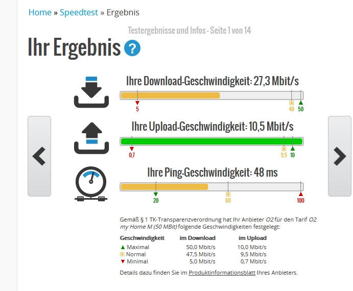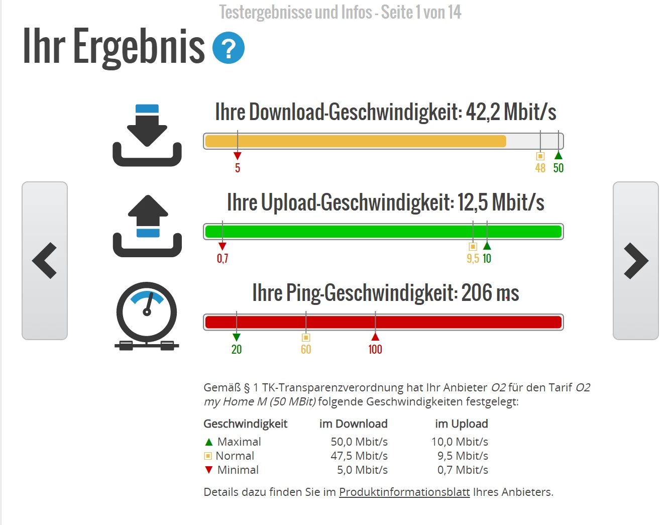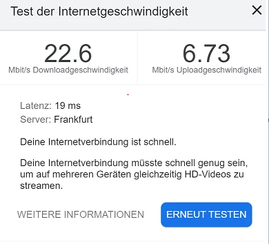 Deshalb habe ich den Router auf die Südseite gestellt. Das sind ca. 13 Meter mit Wände. Dort ist das Internet schneller und ich erhalte gemischte Werte, egal ob ich mich über Lan Kabel verbinde, direkt neben dem Router stehe oder bis zum Arbeitszimmer gehe. Test-Dateien haben von 2,8 mb/s bis 3,8 mb/s immer geschwankt.