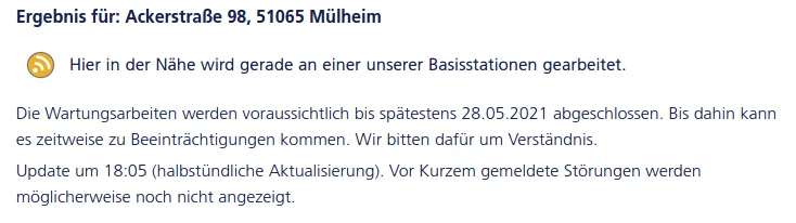 Ich habe meine Wohnung in der Dellbrücker Straße 51067 in der Nähe vom Aldi und ich gehe davon aus, das sich mein LTE Router mit einem Funkmast in der Nähe vom Aldi verbindet. Mein Arbeitszimmer ist auf der Nordseite. Wenn ich den LTE Router dort anschließe, erhalte ich nur maximal 2,0 mb/s. Häufiger eher 1 mb/s.
