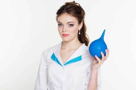 Nacktschwester Ingeborg mit Klistier kurz vor dessem Einsatz
