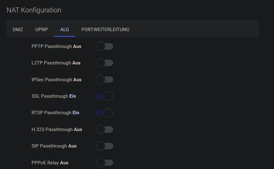 Nun trage ich also unter NAT Konfiguration die von mir benötigten Ports ein und erwarte, dass diese auch von außen als offen erkannt werden die IPv4 DMZ ist auf meinen PC eingestellt, UPNP ist aktiviert und an den ALG einstellungen ist nichts verändert.