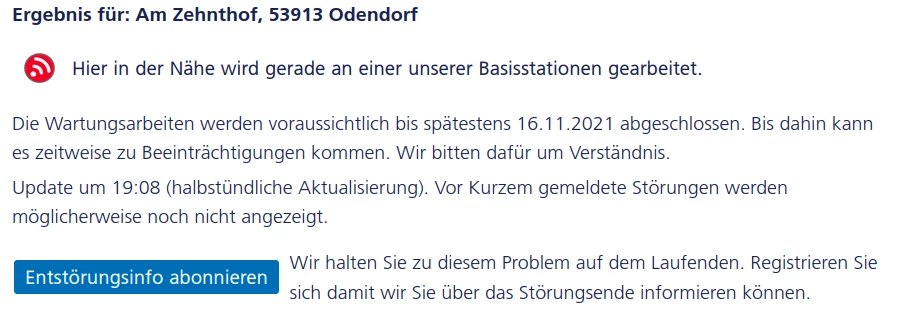 (es kann sein, dass die Basisstation in “Kuchenheim” gerade einen weiteren LTE Ausbau erhält, und du deshalb an der weiter entfernten (?) Basisstation in Odendorf eingebucht bist. Das wäre zumindest meine Vermutung…)
