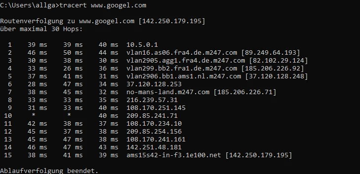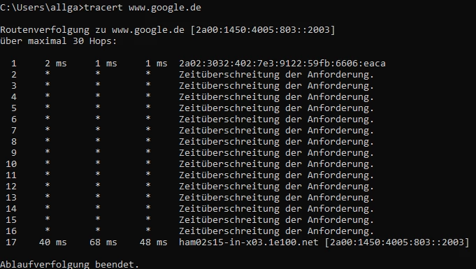 Was sagt denn ein tracert www.google.de (unter Windows)?