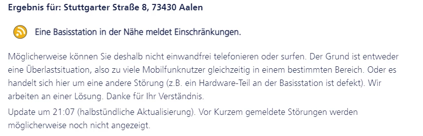 Es liegt für die Adresse eine Störung vor: https://www.o2online.de/netz/netzstoerung/
