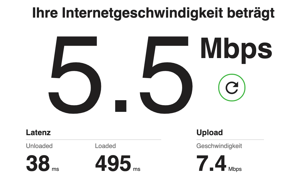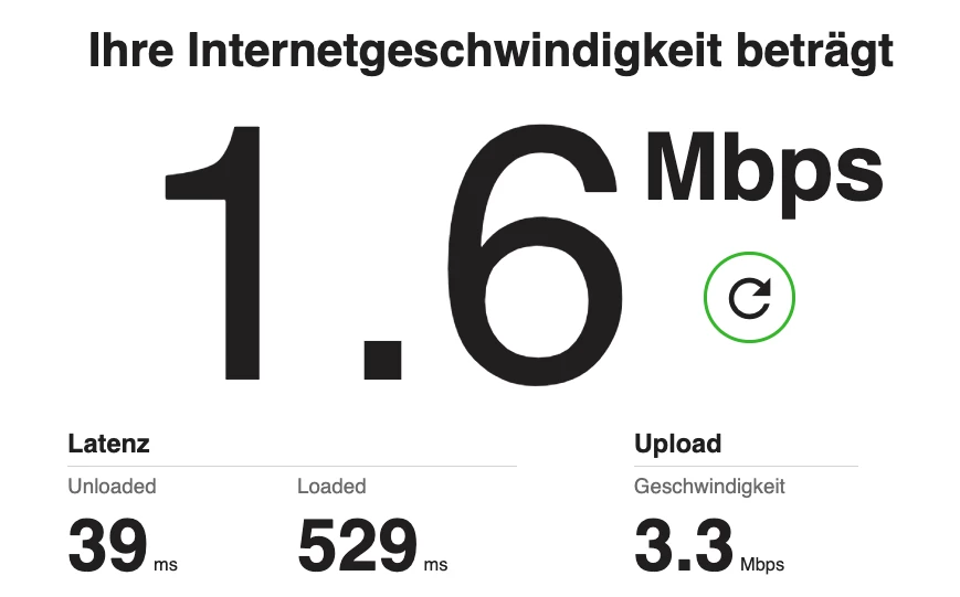 wir haben vor zwei Wochen einen HomeSpot mit dem Tarif o2 my Home M Flex gebucht und bekommen seither nur nur folgende Werte (das ist noch nicht mal eine 2.000er DSL-Leitung):