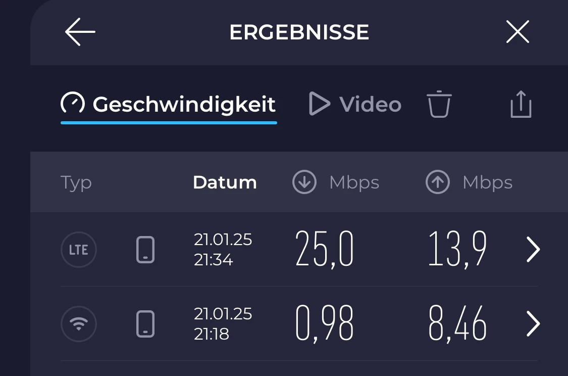 Vielleicht könnte man den Router nochmal überprüfen, auch wenn die SIM-Karte im Handy ebenfalls nur eine niedrige Geschwindigkeit hatte. Warst du mit der SIM-Karte auch mal draußen und hast getestet, wie es dort aussieht?