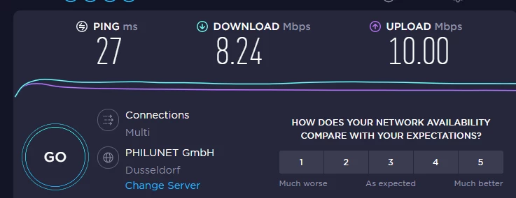 Mit viel Glück schaffe ich es mal auf 16-20 mbits , allerdings dann auch nur für Sekunden , meistens hängt er allerdings bei 10 mbits , und diese sind komplett instabil .