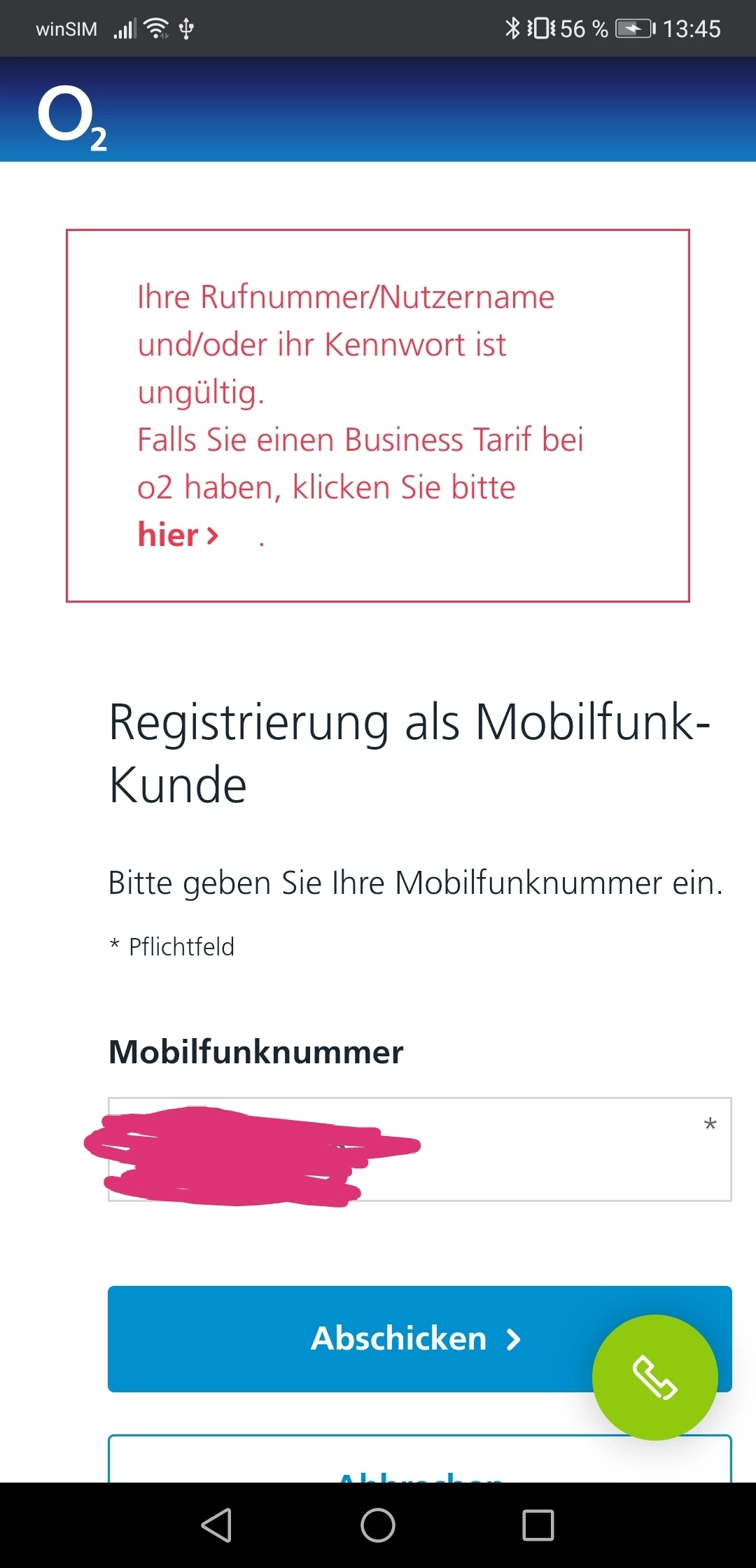 "Ihre Rufnummer/Nutzername und/oder ihr Kennwort ist ungültig."