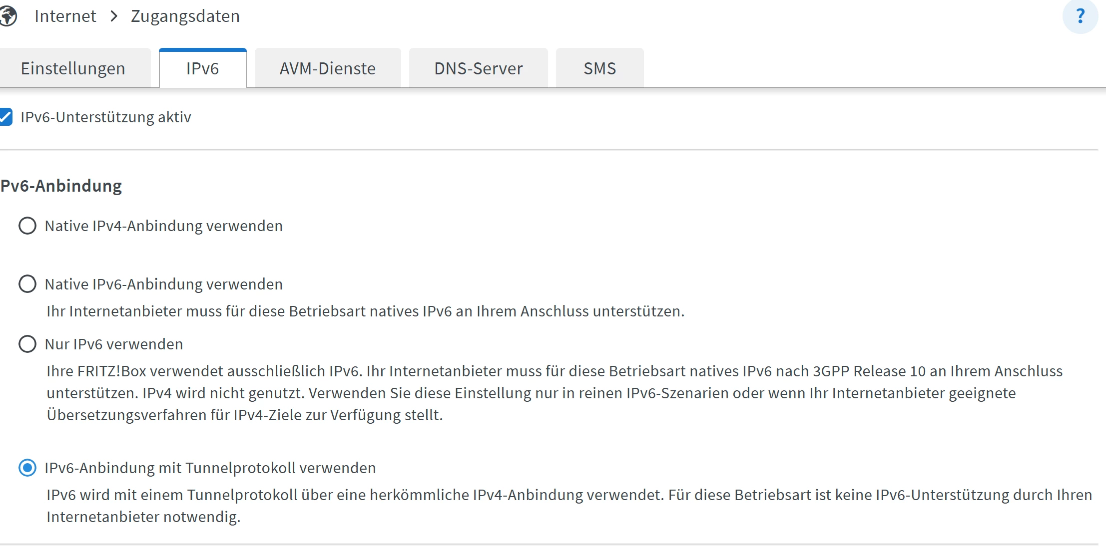 +Nur IPv6 verwenden ,Ihre FRITZ!Box verwendet ausschließlich IPv6. Ihr Internetanbieter muss für diese Betriebsart natives IPv6 nach 3GPP Release 10 an Ihrem Anschluss unterstützen. IPv4 wird nicht genutzt. Verwenden Sie diese Einstellung nur in reinen IPv6-Szenarien oder wenn Ihr Internetanbieter geeignete Übersetzungsverfahren für IPv4-Ziele zur Verfügung.
