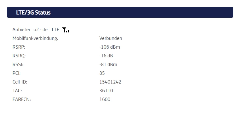 Sei bitte so nett und zeige mal den 3G/LTE-Status Deines Routers. So kann man sich ein Bild von Deiner Umgebung machen. Grundsätzlich möchte ich vorab aber schicken, dass 20 Mbit/s durchaus für LTE akzeptabel ist! Wenn Du nicht weisst, wie man ins Routermenu kommt, nenne uns nur eine PLZ und dann sehen wir weiter.