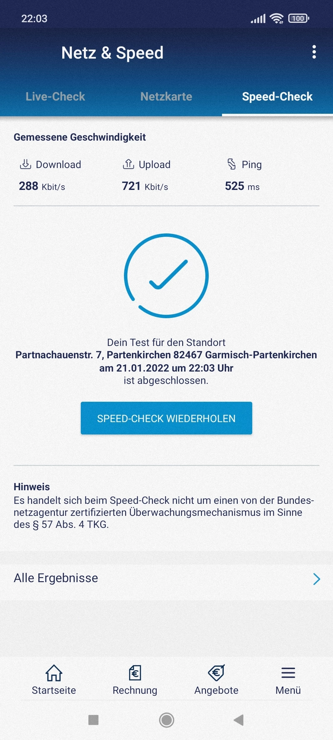 Dann weiss ich ja nicht, wie Du wohnst, aber ich nehme an zur Miete. Hast Du Zugang zum Dachspeicher? Wenn ja, denn setze die Router-SIM mal bitte in ein LTE-Handy ein und begebe Dich eben zum Dachspeicher und mache dort neue Speedtests.