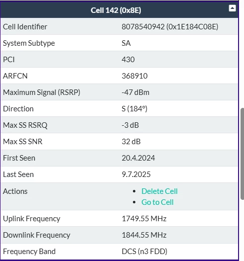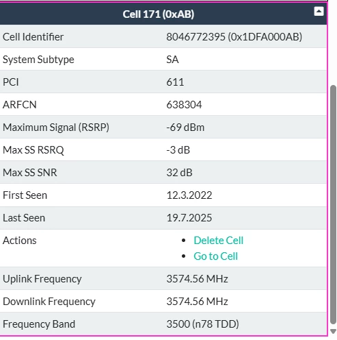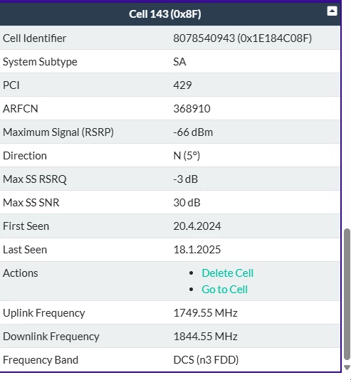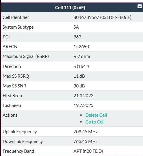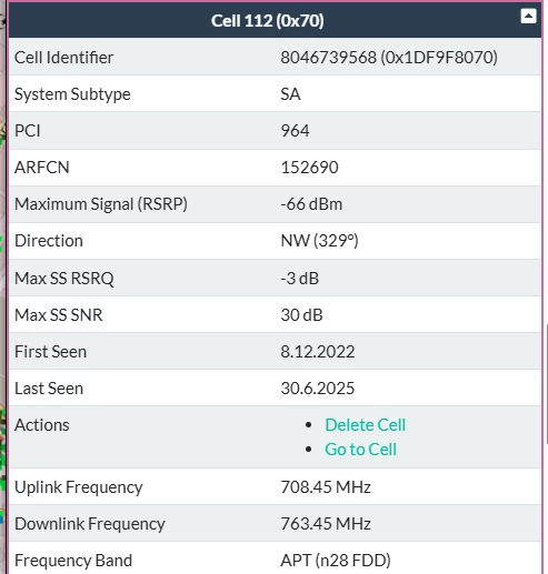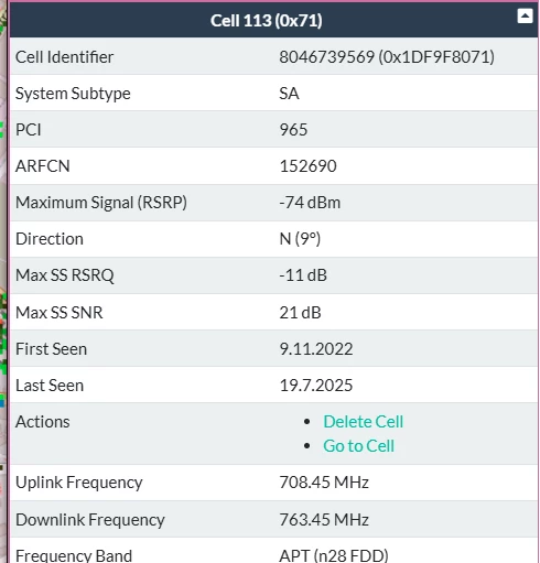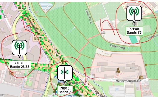 Also es werden mir drei Funkmasten in der nähe angezeigt. Gibt aber noch mehr wenn man weiter rauszoomt. Bei einigen kann ich auch die Kennzeichnung n28 und n78 erkennen (ohne zu wissen, was es genau bedeuten mag ;-)