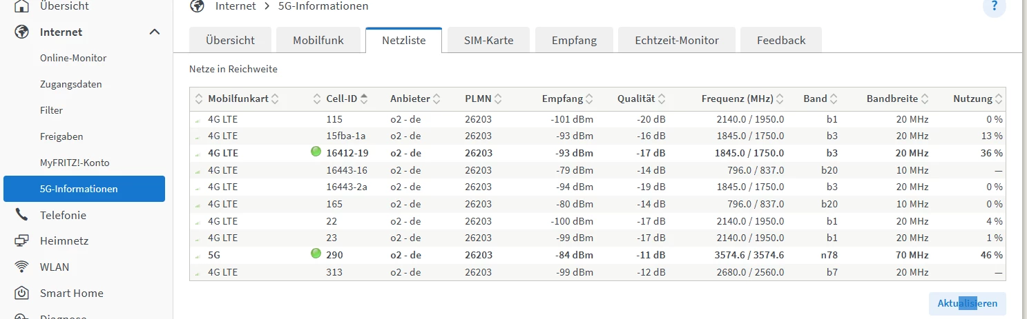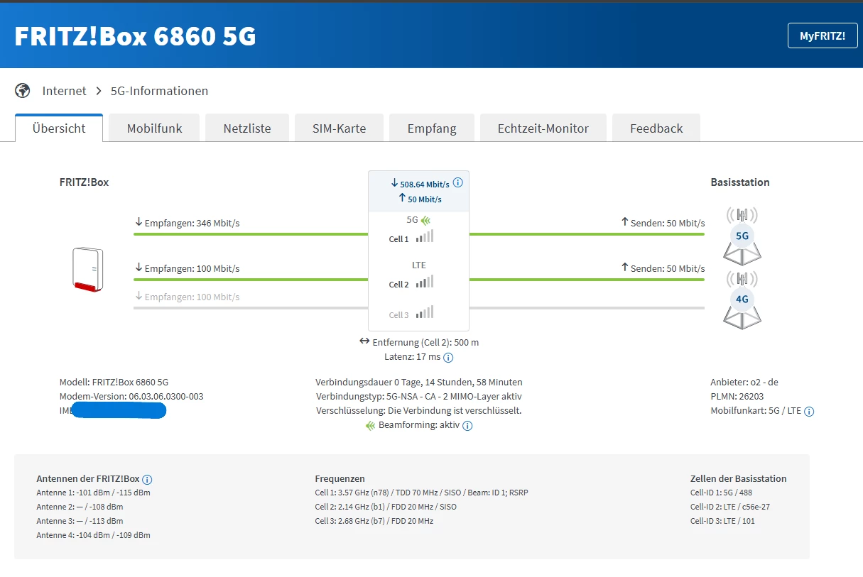 Bei mir sieht das auch so aus B3 (4G) / n78 (5G NSA). Nur die Enfernung ist größer als bei mir.