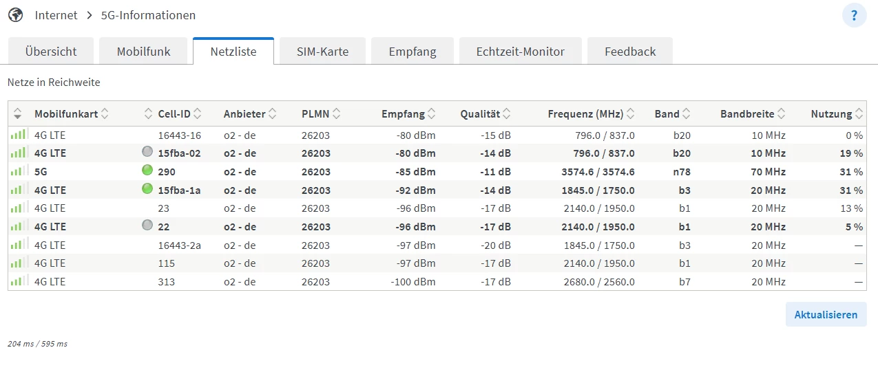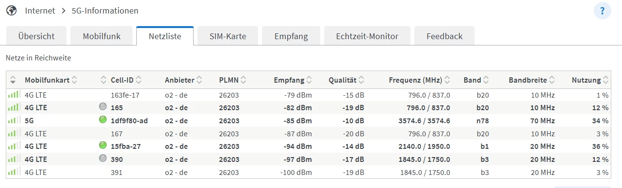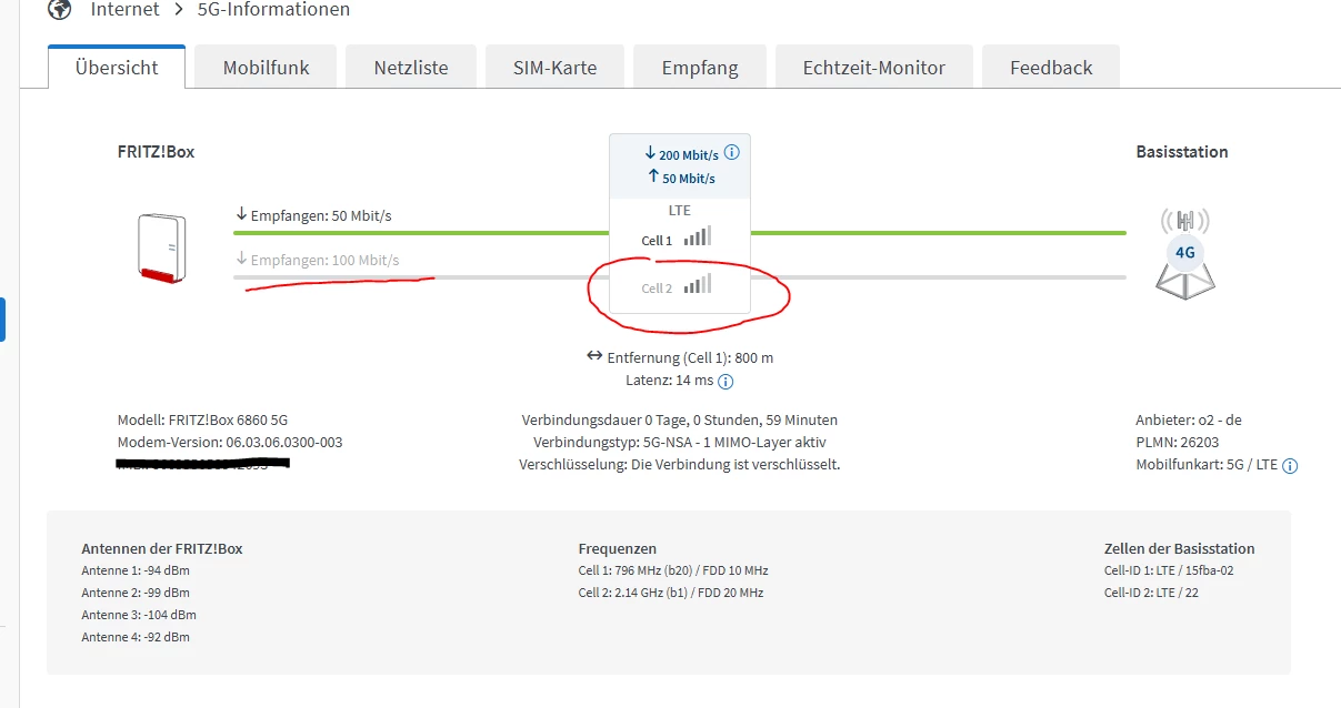 Deine Fritzbox nutzt hier weiterhin die LTE Station bei “A”, und das 5G N78 kommt von der Station “C”.