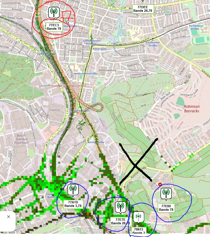 Aber nochmal. Ich check es nicht: Im Bereich des schwarzen X sitze ich. Im Umkreis sind vier!!! 5G o2 Masten ( blaue Kreise). Warum nimmt er bitte den weit enferntesten? (Im Bild mit A gekennzeichnet). Kann man der Fritte nicht sagen “ hey, nimm doch bitte die welche am nähsten liegen und nicht die welche am weitesten weg sind..”
